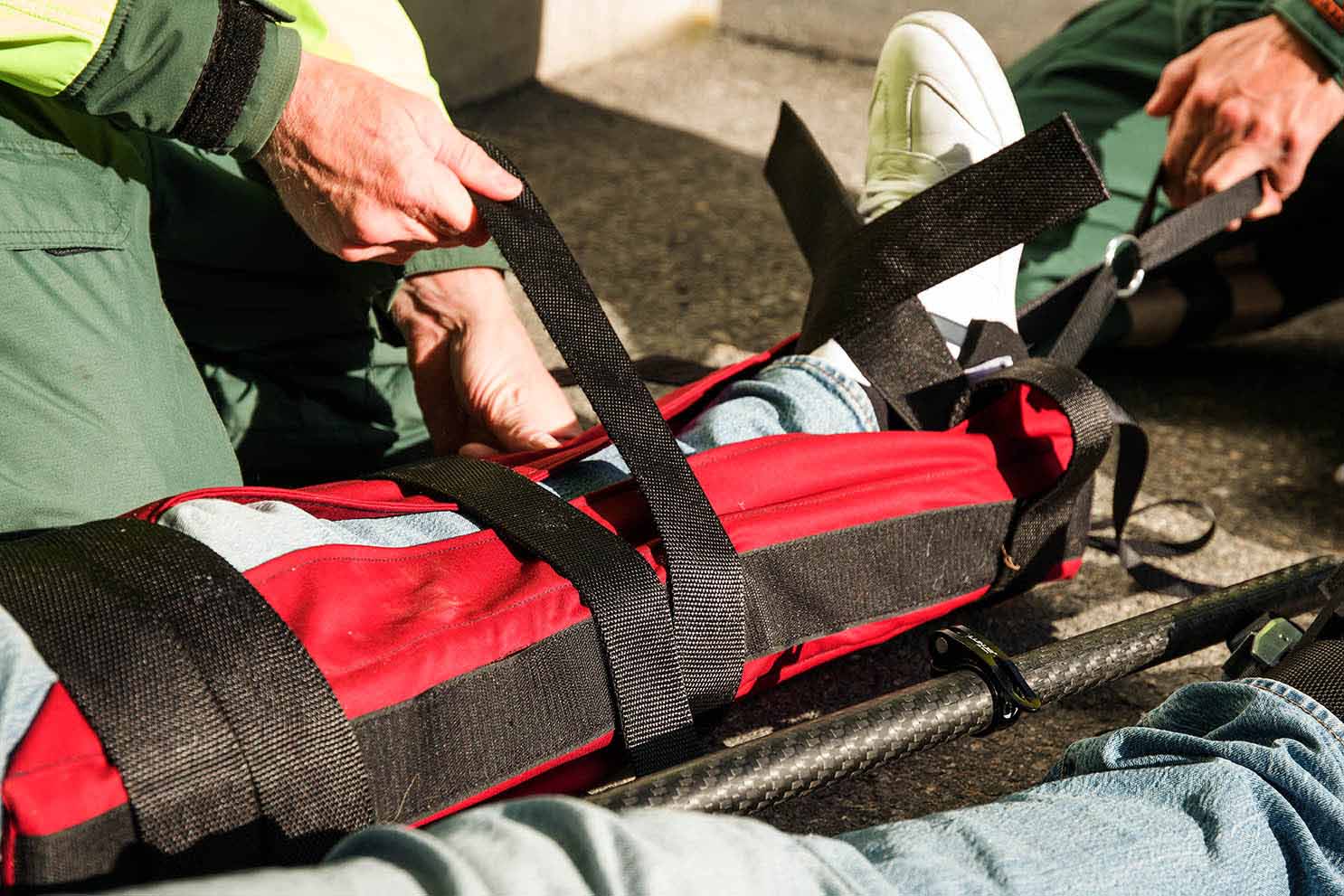 | Effektiv traktion & Fixering | Staget sätts mellan benen, drag skapas på det frakturerade benet. Madrasserna sätts runt benet och fästs i staget med hjälp av fotselen. |